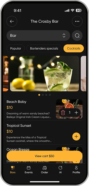 Smart upsells suggest pairings and premium pours, while one-tap reorders increase frequency and average check size.